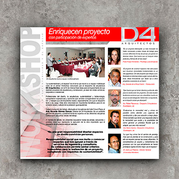 En D4, somos un equipo multidisciplinario de arquitectos y diseñadores cuya visión de la arquitectura contempla un diseño a la medida del cliente, con base en sus necesidades para ofrecerle una solución más allá de lo funcional o de una propuesta formal, con el sentido de crear ambientes generados a través de la empatía con el usuario.